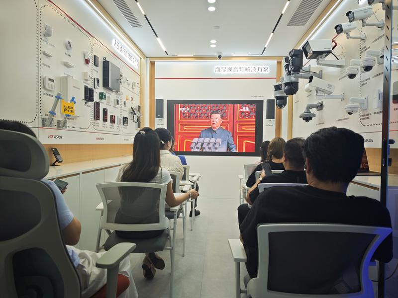 9月3日上午,雨沐晴風(fēng)科技有限公司組織全體員工在海康威視城市展廳觀看了紀(jì)念中國人民抗日戰(zhàn)爭暨世界反法西斯戰(zhàn)爭勝利80周年閱兵儀式直播。全體員工莊嚴(yán)肅立,注視著屏幕中天安門廣場上的盛大場面。當(dāng)國旗升起、國歌奏響時,大家深切感受到今天和平與發(fā)展的來之不易,民族自豪感油然而生。選擇在海康威視展廳觀看閱兵儀式別有深意。海康威視作為全球領(lǐng)先的科技企業(yè),其展示的智能物聯(lián)、AI識別等先進技術(shù),與閱兵儀式上展示的國防現(xiàn)代化建設(shè)成果交相輝映,展現(xiàn)了我國科技創(chuàng)新的強大實力。 觀看結(jié)束后,員工們紛紛表示,這是一次深刻的愛國主義教育,讓大家更加珍惜當(dāng)下、銘記歷史。要繼承和發(fā)揚抗戰(zhàn)精神,在各自崗位上努力創(chuàng)新,為國家發(fā)展貢獻力量。公司領(lǐng)導(dǎo)表示,組織觀看閱兵儀式是為了讓員工牢記抗戰(zhàn)精神,將愛國情懷轉(zhuǎn)化為工作動力,共同創(chuàng)造更好的未來。